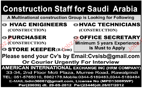 HVAC Engineers, Purchaser, Store Keeper Job Opportunity