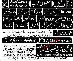 HVAC Engineers, Shift Engineers, Civil Engineers, HVAC Technicians, Data Entry Operators, Tile Fixers, Plumbers, Electricians and Cleaning Foreman are required in Saudi Arabia