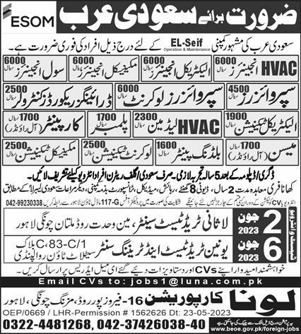 Luna Corporation latest Overseas Industrial jobs and others can be applied till 6 June 2023 or as per closing date in newspaper ad. Read complete ad online to know how to apply on latest Luna Corporation job opportunities. Skills in Drawing, HVAC, Mechanical Engineering, Engineering, Carpentry, Civil Engineering, Electrical Engineering, Plumbing and Masonry may be preferred for these Luna Corporation jobs. Salary varies from 465000. Overtime might be allowed. Free medical, transport and accommodation may be available.