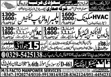 Quaid Technical Training Center invites applications for job positions advertised in daily Express dated 10 July 2025 for following vacancies in Riyadh, dammam Saudi Arabia.