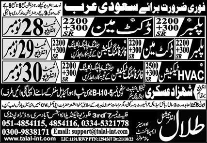Talal International Overseas Employment Promoters Riyadh, riyadh Saudi Arabia invites applications from eligible candidates for the post of hvac technician, ductman, fire fighting technician and plumber as per advertisement of November 23, 2022 published in daily Express Newspaper. Educational qualifications required Matric, Intermediate and Middle etc.