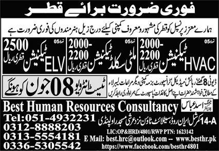 Best Human Resources Consultancy Qatar, qatar Qatar invites applications from eligible candidates for the post of elv technician, hvac technician and multi skilled technician as per advertisement of June 7, 2023 published in daily Express Newspaper. Matric and Intermediate etc. educational qualification will be preferred.