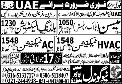 New Gondal Manpower Bureau invites applications for job positions advertised in daily Express dated 15 July 2023 for following vacancies in Abu Dhabi, sharjah UAE.