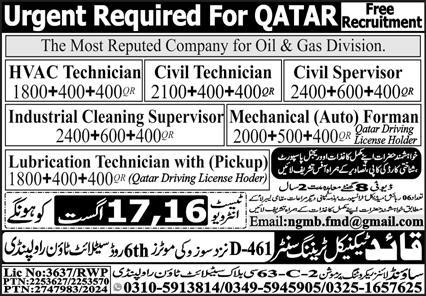 Quaid Technical Training Center invites applications for job positions advertised in daily Express dated 15 August 2024 for following vacancies in Doha, doha Qatar.