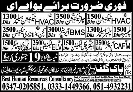Vacant posts including plumber helper, elv technician, laundry technician, plumber, hvac technician helper, kitchen technician, skilled carpenter, chiller technician, cafm operator, electrical technician, hvac technician and bms operator are announced in Pak Gulf Tec Ni Test & Training Center Sharjah, abu dhabi UAE as per 17 January 2023 advertisement in daily Express Newspaper. Preferred Education is Intermediate, Matric and Bachelor etc.