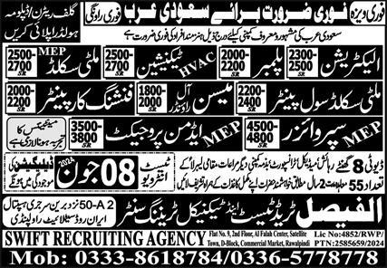 Al Faisal Trade Test & Technical Training Center Dammam, jeddah Saudi Arabia invites applications from eligible candidates for the post of finishing carpenter, mep supervisor, plumber, mep admin project, mason, mep multiskilled technician, multiskilled civil painter, electrician and hvac technician as per advertisement of June 7, 2024 published in daily Express Newspaper. Candidates with Intermediate, B.E, DAE, Matric and Bachelor etc. educational background will be preferred.