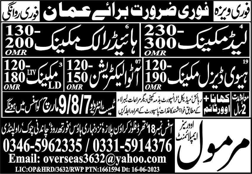Marmol Overseas Employment is looking for candidates for following posts as per job advertisement published in daily Express Newspaper of March 1, 2024 for location Muscat, muscat Oman: