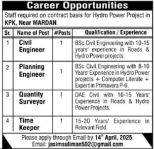 Hydro Power Project invites applications for job positions advertised in daily Mashriq dated 7 April 2025 for following vacancies in Mardan, mardan Khyber Pakhtunkhwa KPK Pakistan.
