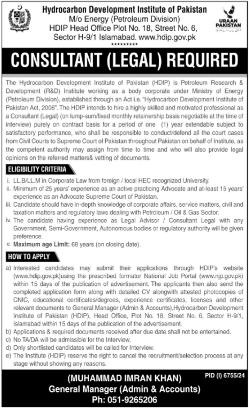 Petroleum Division, Ministry of Energy, Hydrocarbon Development Institute of Pakistan HDIP jobs advertisement dated about 4 April 2025 in daily Express Tribune Newspaper invites application for the vacant post of legal consultant in H-9 Islamabad, islamabad Islamabad Pakistan. Candidates with LLb and LLM etc. educational background will be preferred.