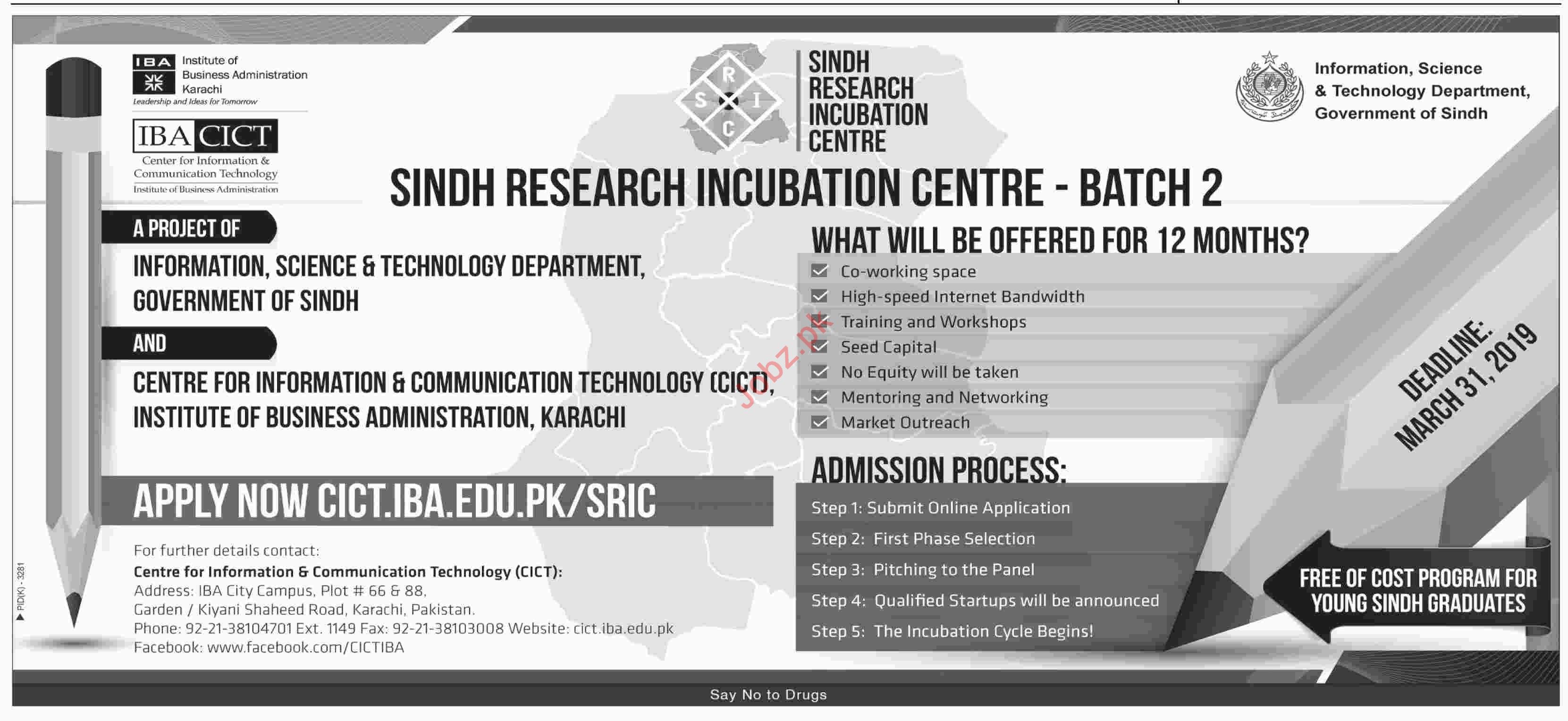 IBA CICT Sindh Research Incubation Centre Karachi, Pakistan are opened admissions spring 2019 for the classes of Diploma in Co working Space, Seed Capital & Internet Bandwidth . Read newspaper ad for exact details.