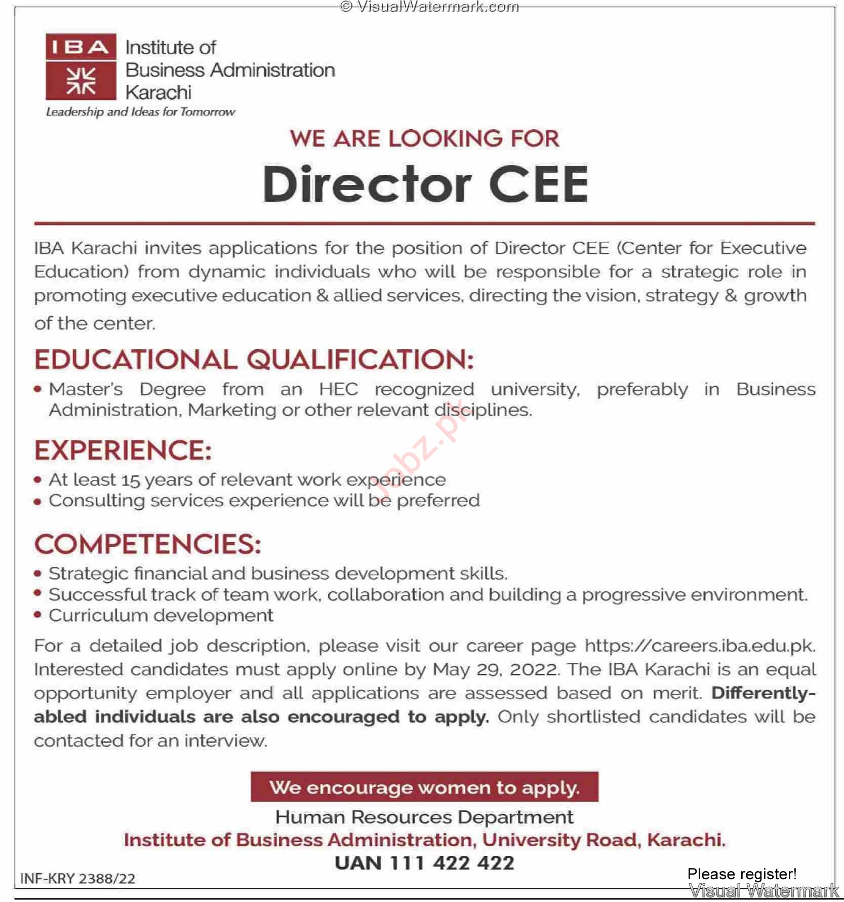 Institute of Business Administration IBA jobs advertisement dated about 15 May 2022 in daily Dawn Newspaper invites application for the vacant post of director cee in Karachi, karachi Sindh Pakistan. Master etc. educational qualification will be preferred.