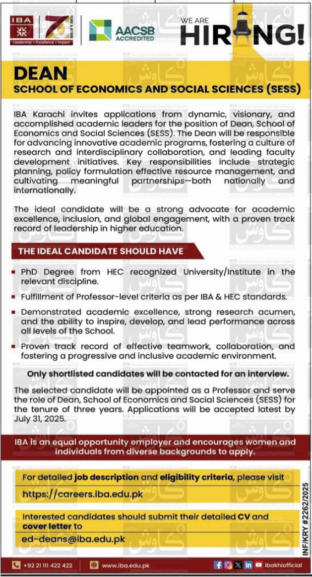 Institute of Business Administration IBA is looking for candidates for following posts as per job advertisement published in daily Kawish Newspaper of July 21, 2025 for location Karachi, karachi Sindh Pakistan: