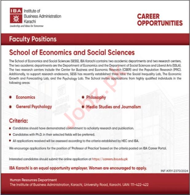 Vacant posts including lecturer, associate professor, professor and assistant professor are announced in Institute of Business Administration IBA Karachi, karachi Sindh Pakistan as per 28 July 2024 advertisement in daily Jang Newspaper. Candidates with MS, Phd and Mphil etc. educational background will be preferred.