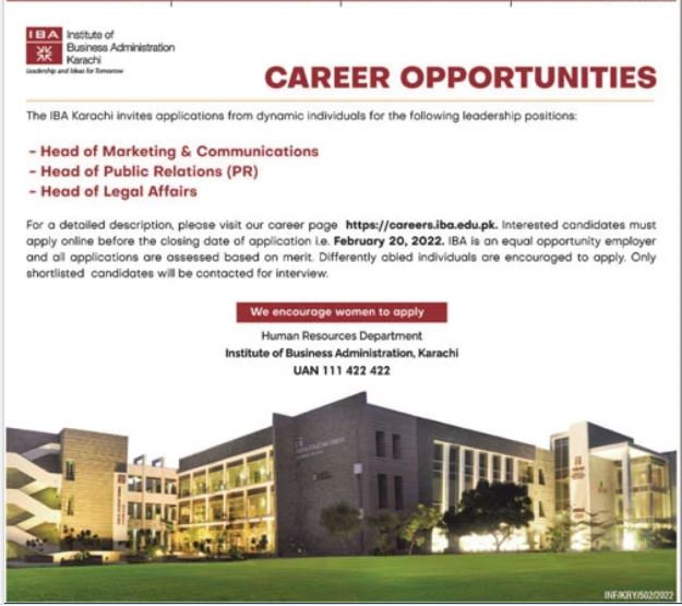 Institute of Business Administration IBA invites applications for job positions advertised in daily Jang dated 6 February 2022 for following vacancies in Karachi Sindh Pakistan.