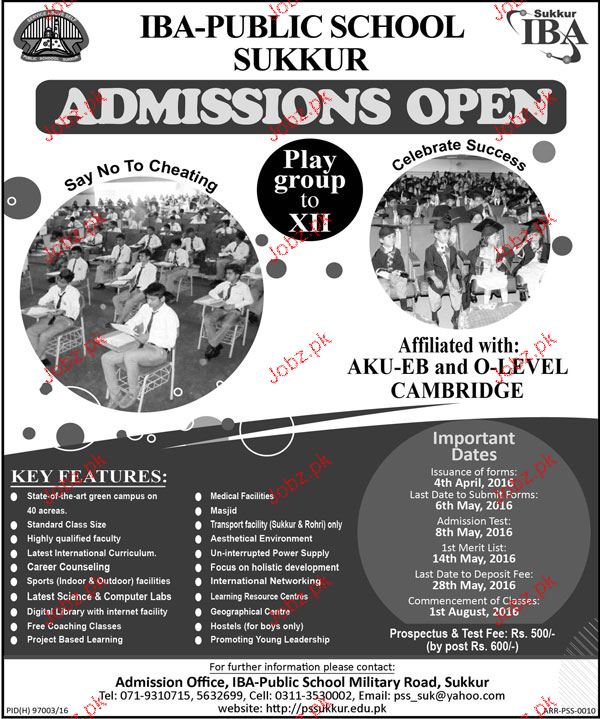 IBA Public School Sukkur Admission in Playgroup to XII in Sukkur. Read newspaper ad for exact details.