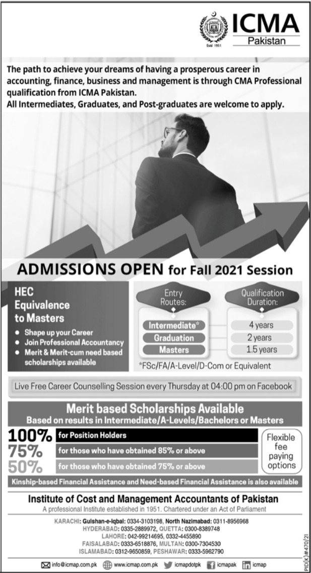 Institute of Cost & Management Accountants of Pakistan ICMA a professional institute invites applications for admissions in CMA Professional in Karachi Sindh Pakistan 2021. Read newspaper ad for exact details.