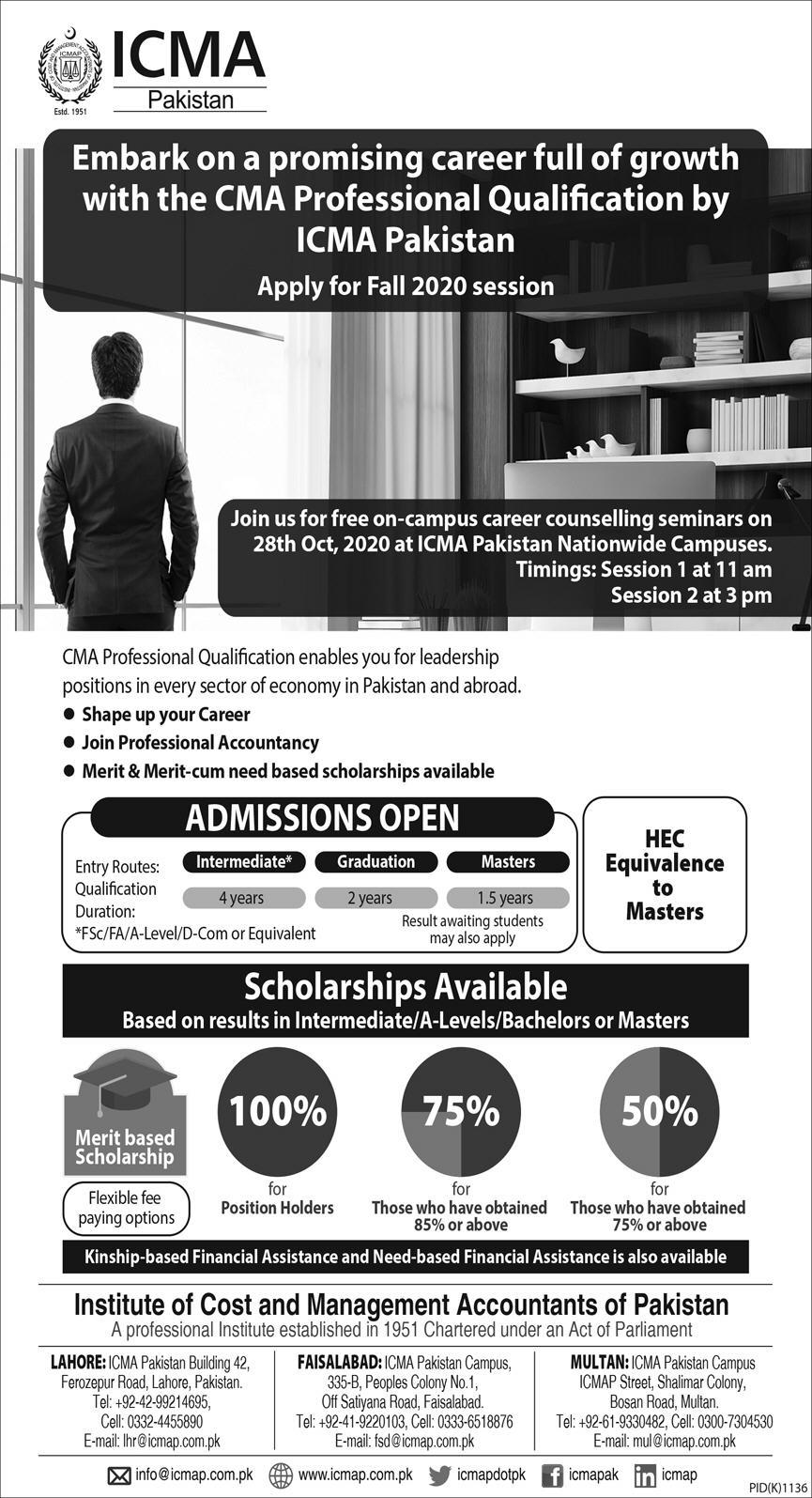 Institute of Cost & Management Accountants of Pakistan ICMA has announced admissions in CMA Professional Courses in Lahore, Faisalabad & Multan Punjab Pakistan 2020. Read newspaper ad for exact details.