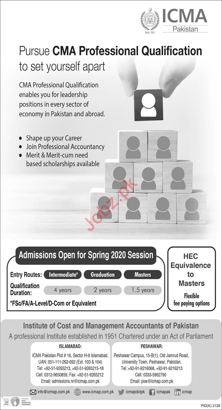 Institute of Cost & Management Accountants of Pakistan ICMA invites application for admissions spring 2020 for ACCA, CA in Islamabad and Peshawar. All student submit their admissions for before last date. Read newspaper ad for exact details.