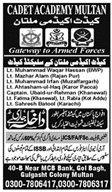 Cadet Academy Multan ICS, FSC admissions 2025 has been announced. Eligible students can apply for academic admissions 2025 in Cadet Academy Multan Multan Punjab Pakistan for Science College. Students for admissions in & criteria can apply as per Private institute admission policy 2025 before closing date as per advertisement. Read newspaper ad for exact details.