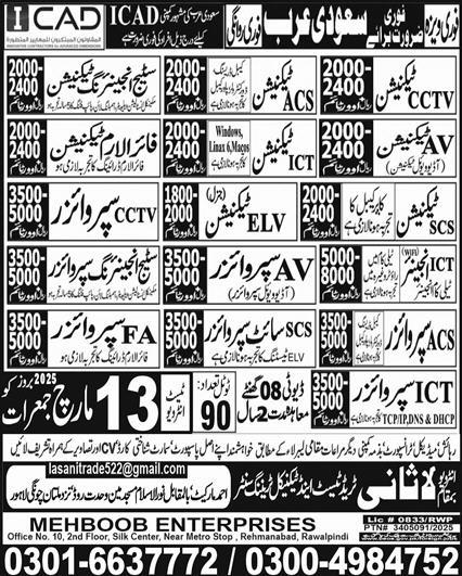 Vacant posts including ict supervisor, elv technician, fa supervisor, stage engineering supervisor, scs technician, ict engineer, cctv supervisor, stage engineering technician, audio visual supervisor, scs site supervisor, acs supervisor, ict technician, audio visual technician, av programmer, acs technician, telecom engineer, av technician, av supervisor, fire alarm technician and cctv technician are announced in Lasani Trade Test & Technical Training Center Riyadh, dammam Saudi Arabia as per 6 March 2025 advertisement in daily Express Newspaper. DAE, Intermediate, Matric, B.E and Bachelor etc. educational qualification will be preferred.