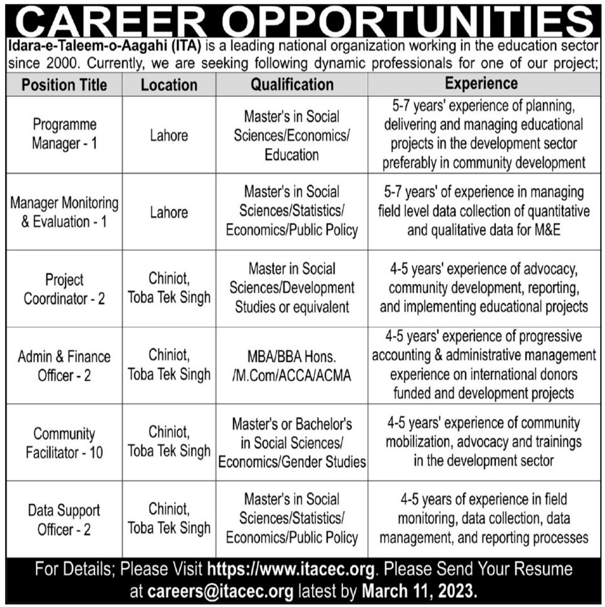 Idara e Taleem o Aagahi ITA is looking for candidates for following posts as per job advertisement published in daily Express Tribune Newspaper of March 2, 2023 for location Lahore, chiniot, lahore and toba tek singh Punjab Pakistan: