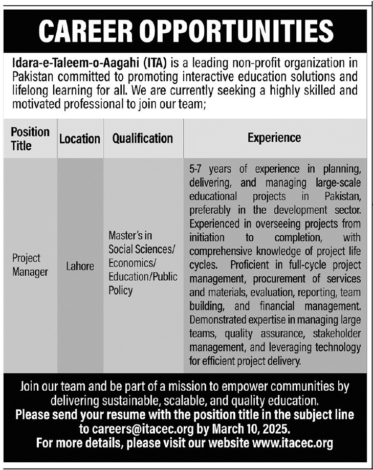 Vacant posts including project manager are announced in Idara e Taleem o Aagahi Gulberg 2 Lahore, lahore Punjab Pakistan as per 4 March 2025 advertisement in daily Express Tribune Newspaper. Master etc. educational qualification will be preferred.