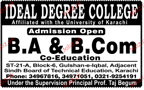 Ideal Degree College Admission in BA and BCom in Karachi Read newspaper ad for exact details.