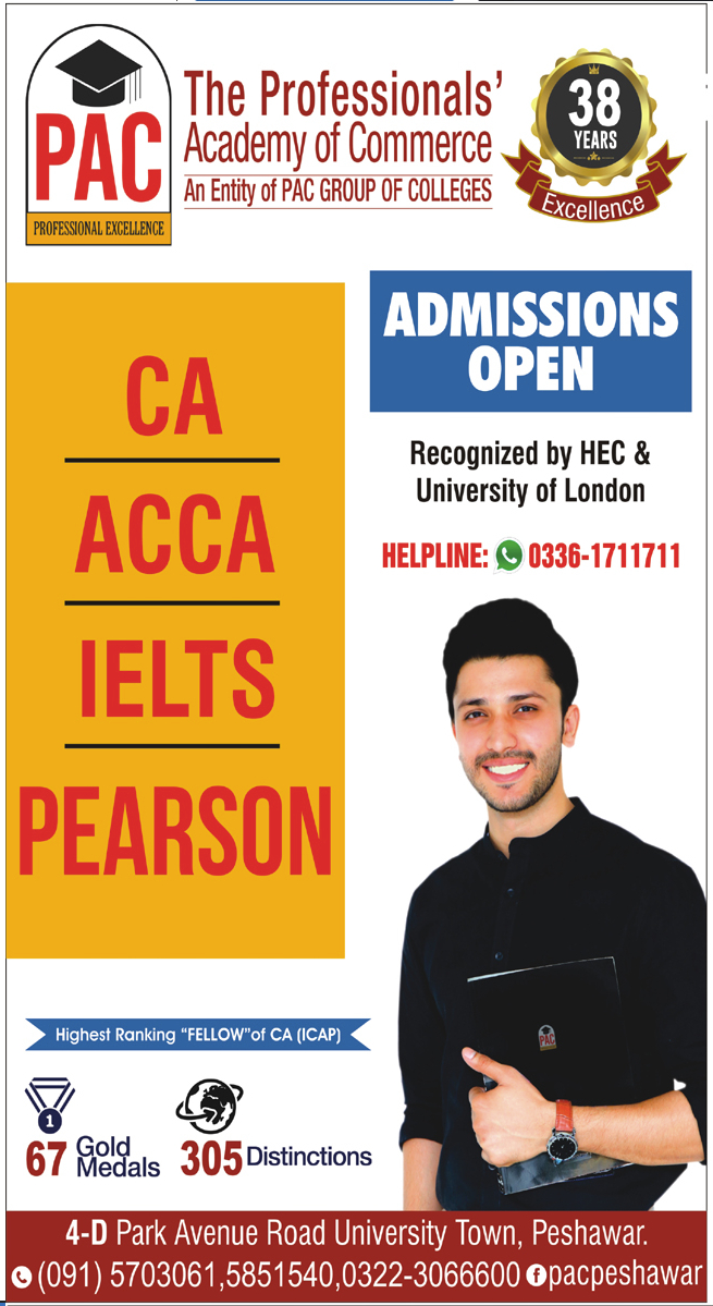 The Professionals Academy of Commerce admissions 2024 for IELTS, CA, ACCA has been announced. Students who want to take admissions in The Professionals Academy of Commerce Peshawar Khyber Pakhtunkhwa KPK Pakistan for academic year 2024 to continue education in Management University can apply. Students for admissions in ACCA, Course and CA & criteria can apply as per Private institute admission policy 2024 before closing date September 9, 2024 as per advertisement. Read newspaper ad for exact details.