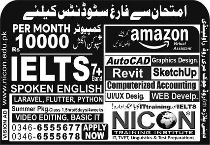 NICON Training Institute admissions 2025 for ielts has been announced. Eligible students who qualify as per admission criteria in NICON Training Institute Rawalpindi Punjab Pakistan can apply in Other College for academic year 2025. Students for admissions in can apply for online or campus classes as per Private institute criteria till admission closing date. Read newspaper ad for exact details.