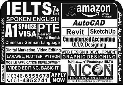 NICON Training Institute has announced admissions 2025 for IELTS. Students who want to take admissions in NICON Training Institute Rawalpindi Punjab Pakistan for academic year 2025 to continue education in Science University can apply. Eligible students for fulfilling criteria for admissions in can enroll as per Government admission policy 2025 till closing date. Read newspaper ad for exact details.