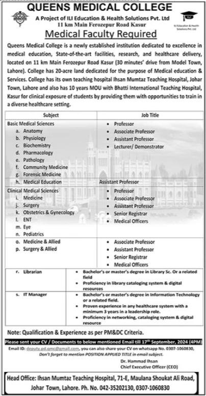 Ihsan Mumtaz Hospital jobs advertisement dated about 12 September 2024 in daily Jang Newspaper invites application for the vacant post of associate professor, professor, medical officer, librarian, it manager, lecturer, assistant professor, registrar and demonstrator in Lahore, lahore Punjab Pakistan. Preferred Education is MBBS, Mphil, Bachelor, Master and Phd etc.
