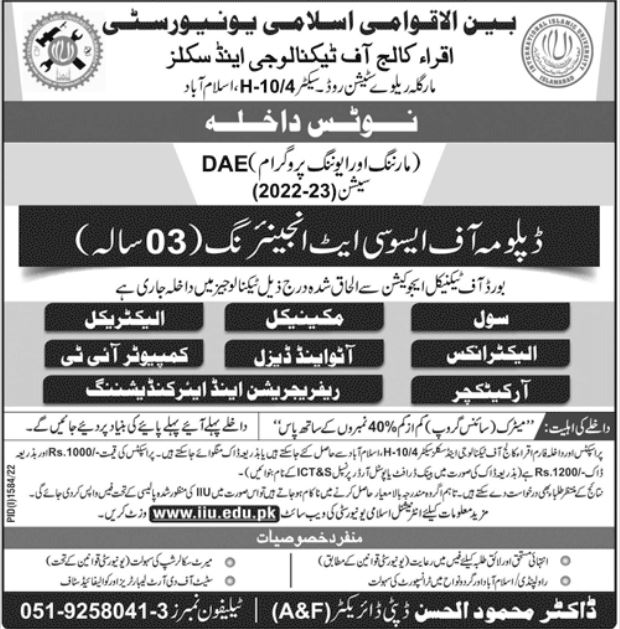 IIU Iqra College of Technology & Skills DAE Admissions 2022