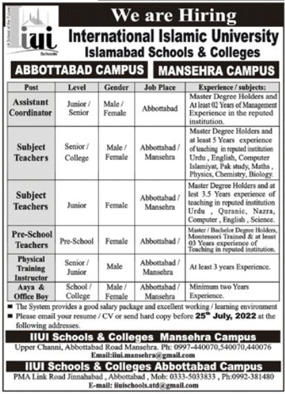 International Islamic University School IIUS invites applications for job positions advertised in daily Aaj dated 18 July 2022 for following vacancies in Abbottabad, mansehra and abbottabad Khyber Pakhtunkhwa KPK Pakistan.
