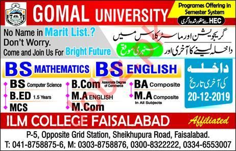 ILM College affiliated Gomal University has announced admissions for Graduate, Masters, BS Mathematics, BS English, BS Computer Science, B.Ed, MCS, B-Com, MA English, M-Com, BA Composite & MA in Faisalabad. Read newspaper ad for exact details.