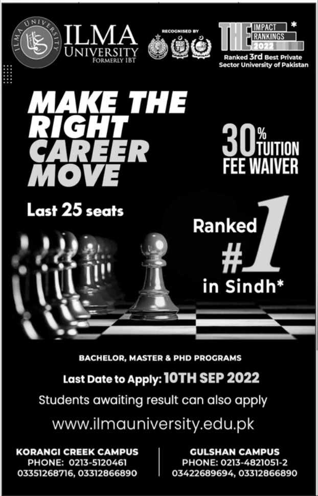 ILMA University Bachelor, Master and PhD Programs Admissions. admissions 2022 has been announced. Students who want to take admissions in ILMA University Karachi Sindh Pakistan for academic year 2022 to continue education in Teaching University can apply. Students for admissions in Master, Phd and Bachelor & criteria can apply as per Private institute admission policy 2022 before closing date September 10, 2022 as per advertisement.