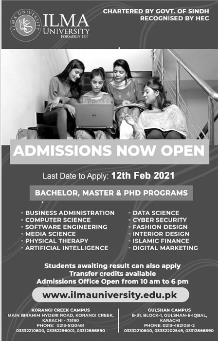 ILMA University is a private, independent university invites applications for online admissions in Bachelor Programs, Master Programs and PhD Programs in Karachi 2021. Read newspaper ad for exact details.