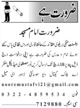 Madrasa invites applications for job positions advertised in daily Jang dated 24 February 2023 for following vacancies in Lahore, lahore Punjab Pakistan.