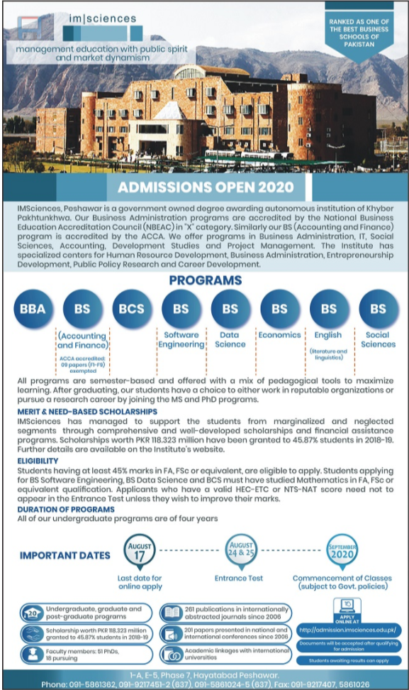 IMSciences Peshawar is a government own degree awarding autonomous institution of Khyber Pakhtunkhwa has announced admissions in BBA, BS Accountant and Finance, BCS, BS Software Engineering, BS Data Science, BS Economics, BS English & BS Social Sciences. Read newspaper ad for exact details.