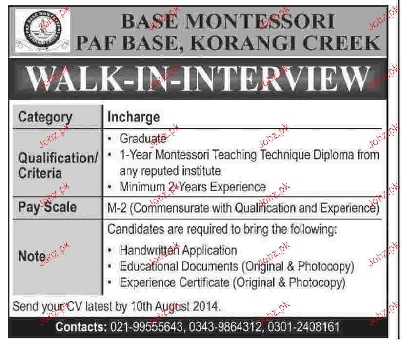 Incharge Base Montessori Job In PAF Base Korangi Creek