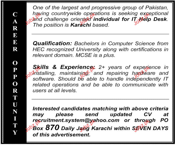 Apply as per details in job advertisement. Login to view further details of how to apply via https://www.jobz.pk online.