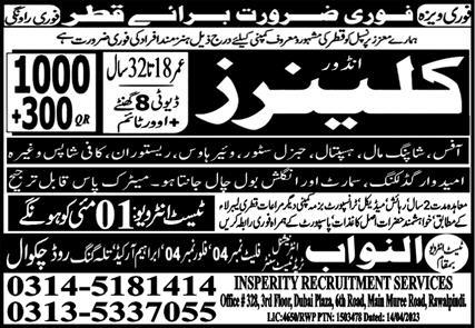 Al Nawab International jobs advertisement dated about 29 April 2023 in daily Express Newspaper invites application for the vacant post of cleaner and indoor cleaner in Qatar, Qatar. Candidates with Matric and Intermediate etc. educational background will be preferred.