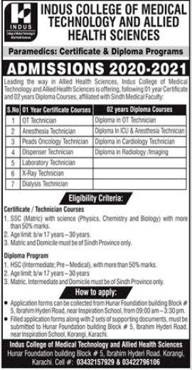Indus College of Medical Technology & Allied Health Sciences has announced admissions for certificate and diploma in OT Technician, Anesthesia Technician, Peads Oncology Technician, Dispenser Technician, Laboratory Technician, X-Ray Technician, Dialysis Technician. Read newspaper ad for exact details.