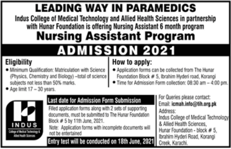 Indus College of Medical Technology & Allied Health Sciences invites applications for admissions in Nursing Assistant 6 month program in Karachi Sindh Pakistan 2021. Read newspaper ad for exact details.