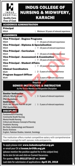 Indus College of Nursing & Midwifery, Karachi wanted Academics Administration and Academics staff for the posts of Principal, Vice Principal - Degree Programs, Diploma & Specialization, Curriculum, Assessment & Examinations, Student Affairs, Clinical Coordinators and Program Support Officer.