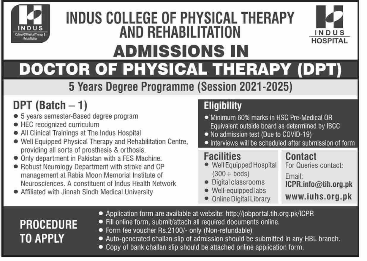 Indus Hospital, Indus College of Physical Therapy & Rehabilitation invites applications for online admissions in Doctor of Physical Therapy DPT 5 Years Degree Programme. Read newspaper ad for exact details.