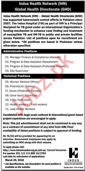 Indus Health Network IHN , Global Health Directorate GHD Karachi is looking for qualified and experienced Administrative and Technical Positions like Manager Finance & Compliance, Program & Data Assistant, Program & Data Assistant, Site Supervisor, Women Medical Officer, Pharmacist, Nurse, Gene Xpert Technician, X-Ray Technician, Health Workers / Field Workers and Lady Health Workers.