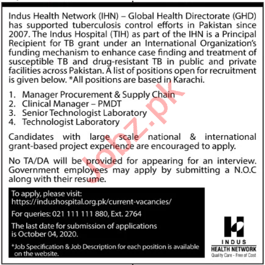 Indus Health Network IHN Jobs 2020 Manager & Technologist