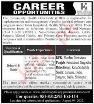 Vacant posts including driver are announced in The Indus Health Network Larkana, sanghar, shikarpur, mardan, dadu, sargodha, faisalabad, nowshera and killa saifullah Sindh Pakistan as per 31 July 2022 advertisement in daily Jang Newspaper. Matric and Middle etc. educational qualification will be preferred.