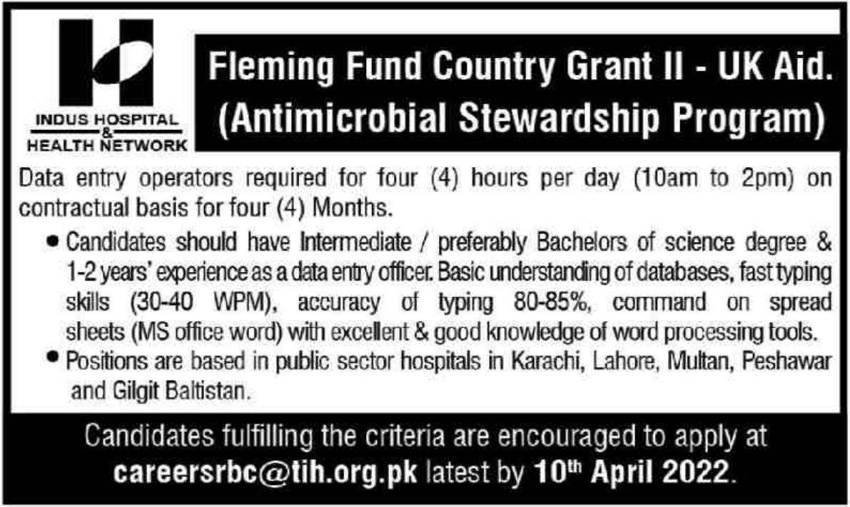 The Indus Hospital jobs advertisement dated about 4 April 2022 in daily Dawn Newspaper invites application for the vacant post of data entry operator, fleming fund country grant ii and antimicrobial stewardship program in Karachi, lahore, multan, gilgit, peshawar and karachi Sindh Pakistan. Educational qualifications required Bachelor and Intermediate etc.