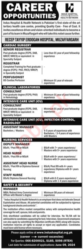Indus Hospital & Health Network invites applications for job positions advertised in daily Jang dated 26 May 2024 for following vacancies in Muzaffargarh, muzaffargarh Punjab Pakistan.